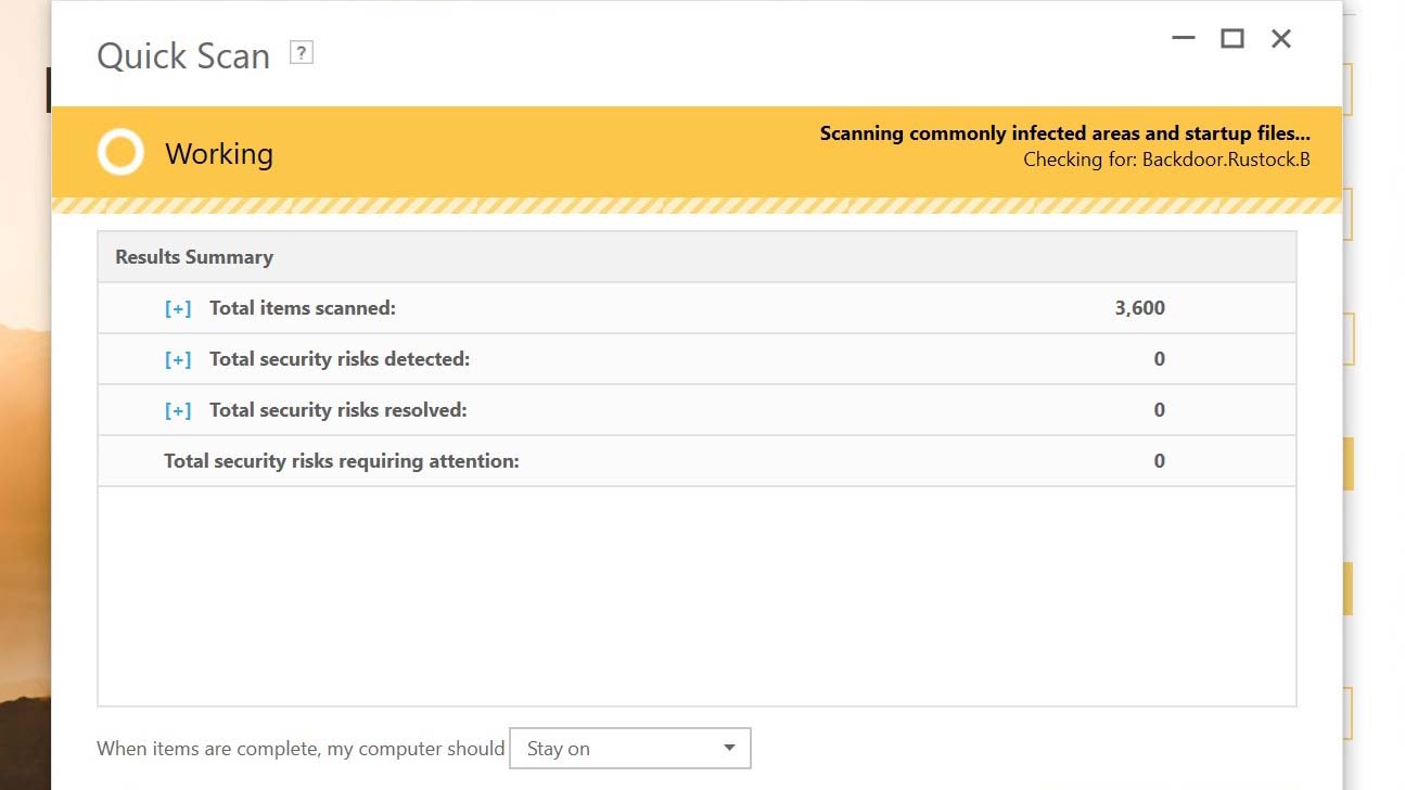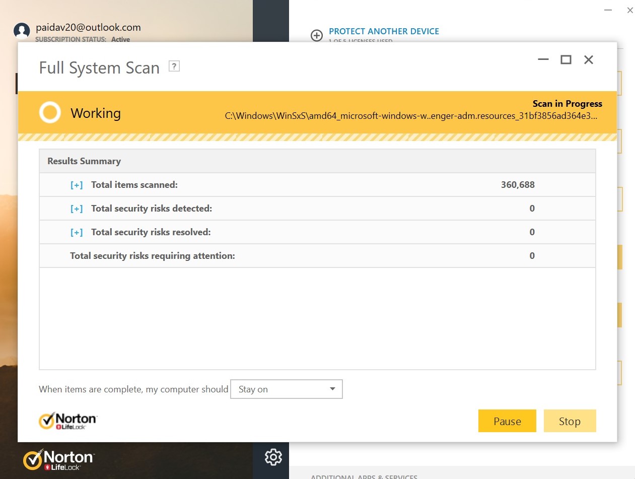 It took Norton 360 Deluxe 18 minutes and 20 seconds to run its first full scan and index all 446,354 files. That time dropped to 6:34 in subsequent scans, after the software learned what to skip. Norton's quick scan took i minute and sixteen seconds to churn through 12,126 files. That'south a bit longer than Kaspersky Total Security'southward quick browse, which looked at nigh four times every bit many files.